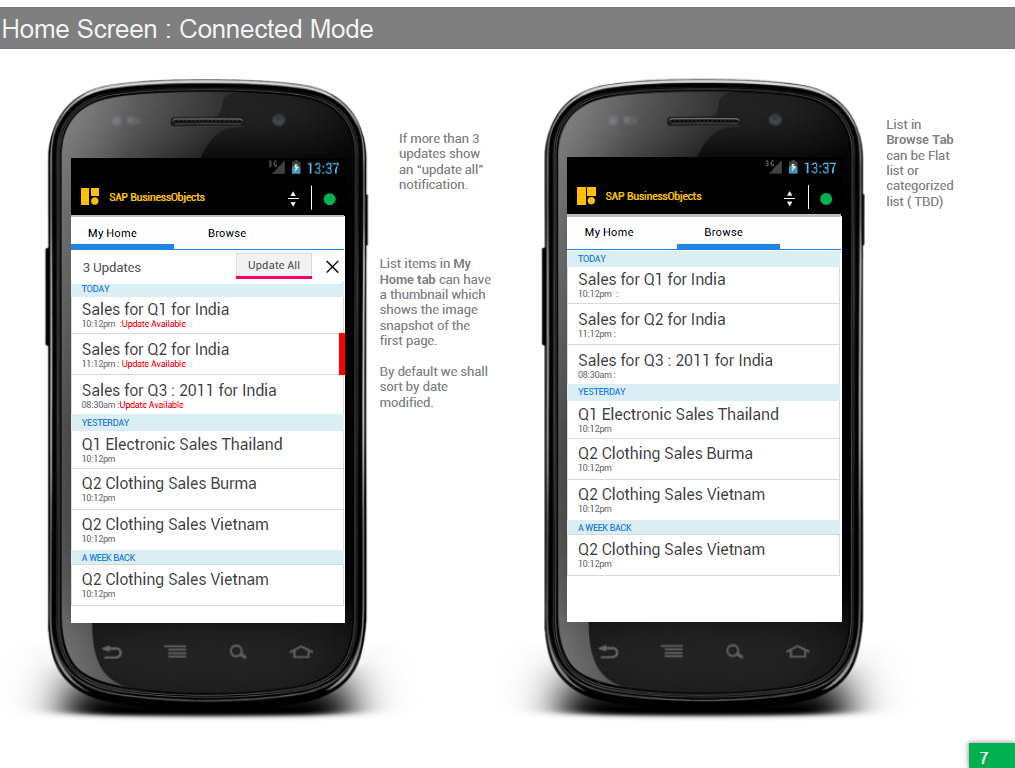 Designed from scratch SAP BOBJ Mobile for analytics for IOS / Android phones and tablets. Did the entire design process from requirements to wireframes to final visual design and usability testing in Orlando.